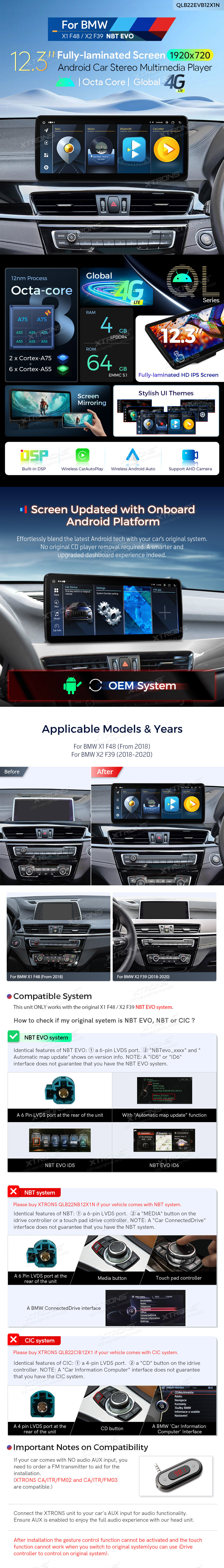 QLB22EVB12X1N 12,3-Zoll-Octa-Core-Autoradio mit 4 GB RAM und 64 GB SSD-Speicher, globalem 4G LTE-Netz und Android 14-Betriebssystem sowie volllaminiertem Display für BMW X1 F48/X2 F39 NBT EVO System