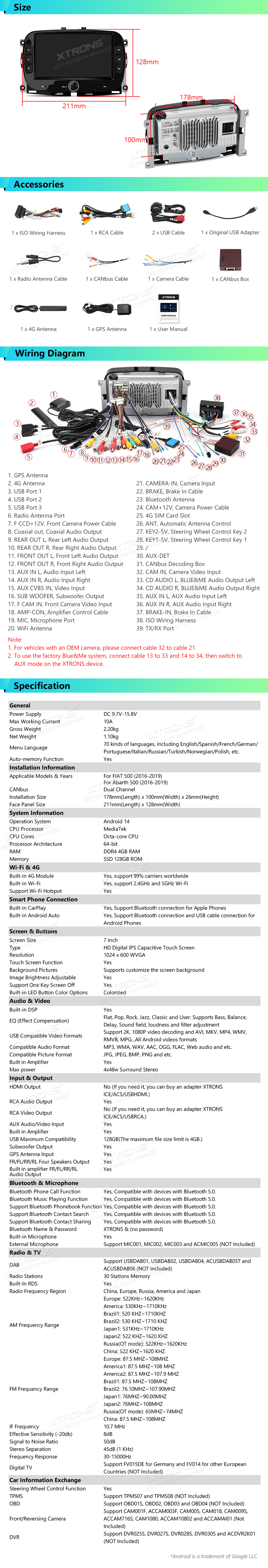 7 Zoll Octa Core 4+128GB Global 4G 1024×600 IPS-Bildschirm Android Autostereo Multimedia-Player für Fiat 500/Abarth 500 (2016-2019)