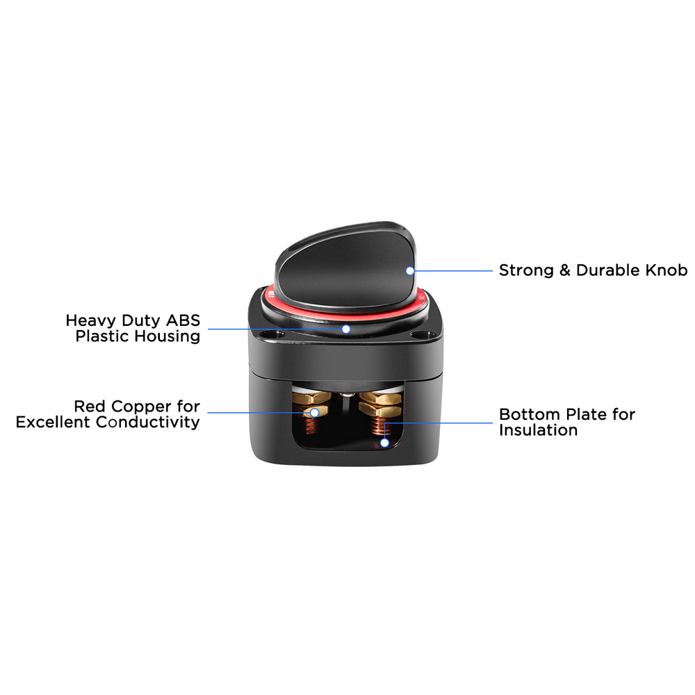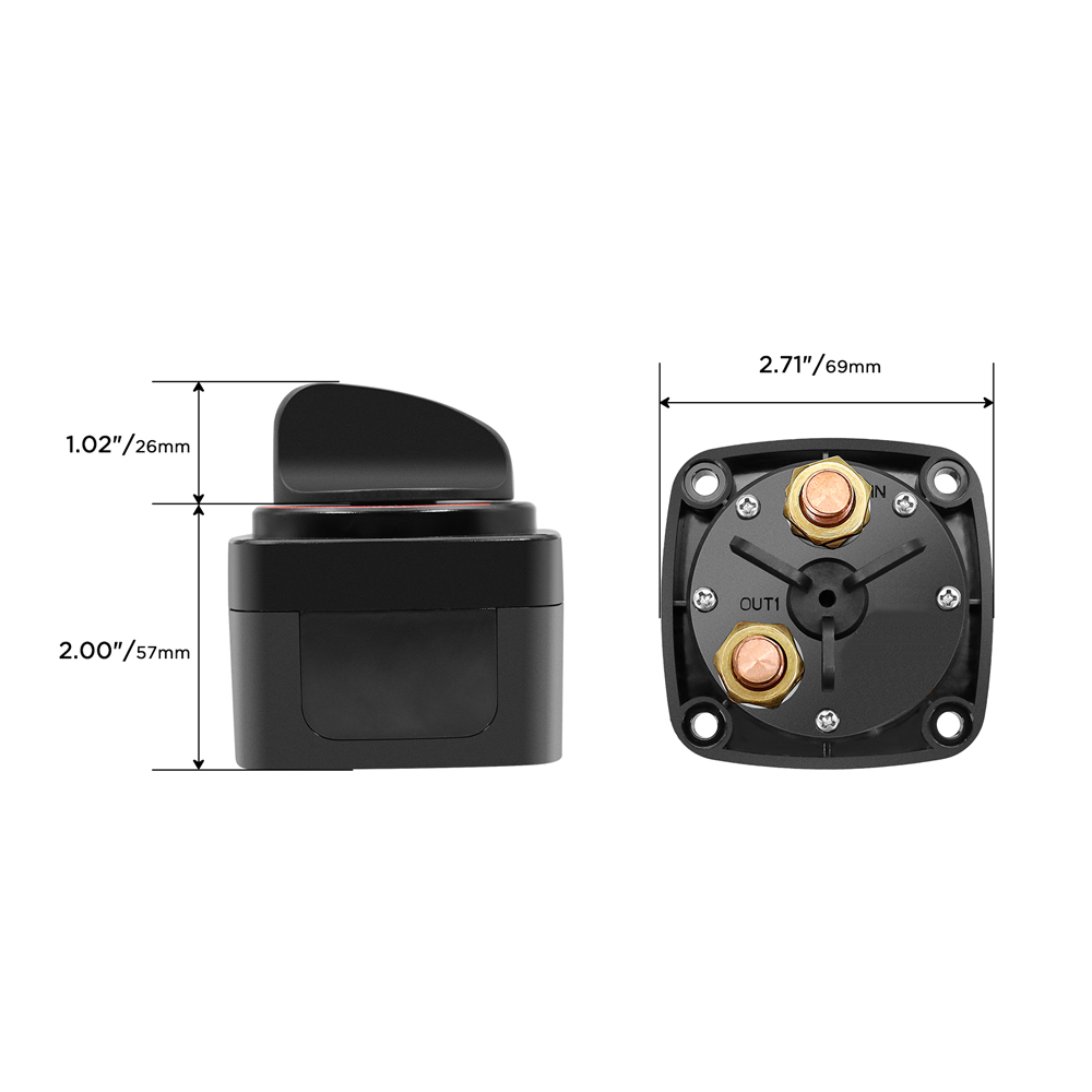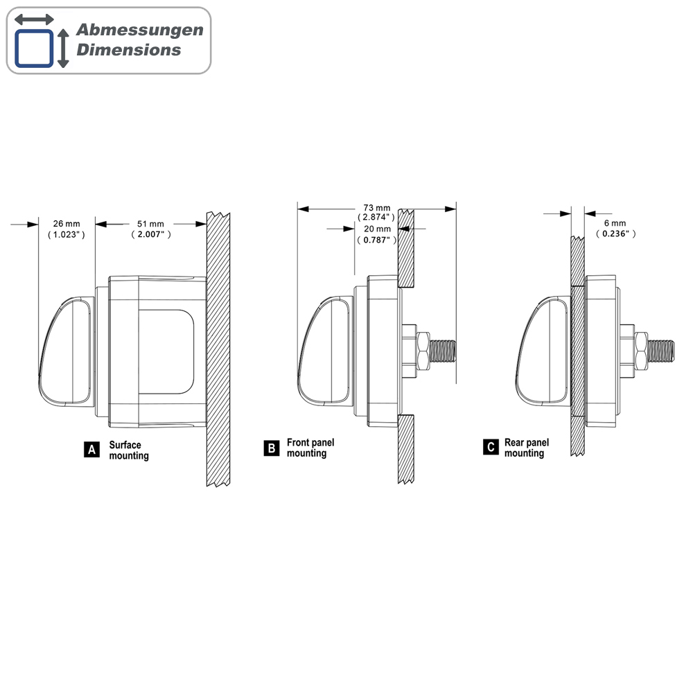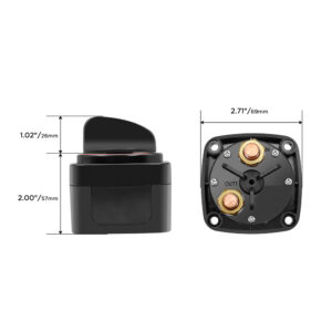 Diese patentierten AMPIRE Batterietrennschalter sind für Oldtimer, Wohnmobile, Lastwagen, Boote und vieles mehr bestens geeignet. Ausstattung – rote LED-Anzeige im Griff (nur bei 12 Volt Betrieb) – Robustes ABS-Kunststoffgehäuse – Bolzen und Muttern aus 100% Kupfer – inklusive 30mm Aufbaurahmen – inklusive Edelstahl-Schrauben für Ein/Aufbau-Installation Technische Daten – Zwei Schaltstellungen: EIN, AUS – max. 250 Ampere Belastbarkeit (Dauer) – max. 400 Ampere Belastbarkeit (Unterbrechungen) – max. 800 Ampere Belastbarkeit (Kurzzeitig) – max. 32 Volt DC Schaltspannung – separater Anschluß für die im Griff integrierte Kontroll-LED – Stromverbrauch der roten Kontroll-LED: 25mA – Abmessungen: 69x69mm (LxB) – Aufbaurahmen: 30mm – Höhe: 45mm bzw. 75mm mit Aufbaurahmen – Einbautiefe: 25mm ohne Aufbaurahmen – wasserdicht nach IPX5 (Schutz gegen Strahlwasser aus allen Richtungen)