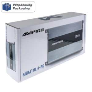 Die Weiterentwicklung unseres Bestsellers bei den Verstärkern, die MBM110.4-2G, wurde in seiner neuen Generation in einigen Details perfektioniert. Die Lautsprecher-Eingänge sind jetzt symmetrisch und können auch bei hochwertigen Soundsystemen verwendet werden. Außerdem spendierten wir der Endstufe einen Bandpass für die Kanäle 1&2. Dadurch wird die MBM110.4-2G noch flexibler einsetzbar. AUSSTATTUNG – 4-Kanal Class D Verstärker – Eingang für optional erhältliche Basspegel-Fernbedienung für 2 oder alle 4 Kanäle – Verbesserte Aktivweiche mit Bandpassfilter – Ultrakompakte Bauform – 4x Cinch- oder 4x symmetrische Lautsprecher-Eingänge per Adapter – 440 Watt RMS / 880 Watt max. – 2 Ohm stabil bzw. 4 Ohm stabil (gebrückt) – Hochwertig beleuchtetes AMPIRE Logo NETZTEIL – Betriebsspannung: 10-16 Volt DC – Ruhestrom: 1,04A – Ruhestrom wenn ausgeschaltet: <0,0004A ENDSTUFE - 2 Ohm stabil bzw. 4 Ohm stabil (gebrückt) - Ausgangsleistung (RMS) @ 14,4V / 4 Ohm: 75 Watt x 4 - Ausgangsleistung (RMS) @ 14,4V / 2 Ohm: 110 Watt x 4 - Ausgangsleistung (RMS) @ 14,4V / 4 Ohm: 220 Watt x 2 (bridged) - Ausgangsleistung (max.) @ 14,4V / 4 Ohm: 150 Watt x 4 - Ausgangsleistung (max.) @ 14,4V / 2 Ohm: 220 Watt x 4 - Ausgangsleistung (max.) @ 14,4V / 4 Ohm: 440 Watt x 2 (bridged) - Klirrfaktor: <0,5% - Signal/Rauschabstand: >90dB – Kanaltrennung: >68dB – Dämpfungsfaktor: 100 – Eingangsempfindlichkeit: 500mV – 15,0V AKTIVWEICHE Kanäle 1+2 – Hochpassfilter/Flankensteilheit: 15Hz – 500Hz / 12dB – Bandpass/Flankensteilheit: HP 15Hz – 500HZ, TP 50Hz – 5000Hz / 12dB – Bassregler (optional) im Bandpass-Modus Kanäle 3+4 – Hochpassfilter/Flankensteilheit: 50Hz – 5000Hz / 12dB KABELQUERSCHNITT DER ANSCHLUSSTERMINALS – Stromversorgung bis 20mm² – Lautsprecher bis 4mm² SONSTIGES – Sicherung: 25A x 2 (intern) – Maximale Abmessungen (LxBxH): 251 x 141 x 50mm – Gewicht: 1,85Kg – Eingänge: RCA x4 für High-Level und Low-Level (High-Level Auto-Turn-On für Radios mit BTL-Endstufen) ZULASSUNG – E-Nummer: E8 10R-04 1281 WICHTIGER INSTALLATIONSHINWEIS! Um einen sicheren Betrieb dieser Endstufe zu gewährleisten, müssen an allen Lautsprecherausgängen, im Stereo- oder Brückenbetrieb, Lautsprecher angeschlossen werden. Weitere Suchbegriffe: MBM110, mbm110, MBM110.4, mbm110.4, MBM100, mbm100, MBM100.4, mbm100.4, MBM100.4-2G, mbm100.4-2g