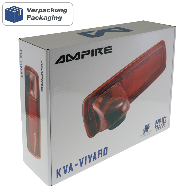 Hochauflösende AHD Rückfahrkamera KVA-VIVARO die anstelle des werkseitigen Bremslichtglases montiert wird. Eine integrierte Infrarotbeleuchtung sorgt bei Dunkelheit für eine ausreichende Ausleuchtung KOMPATIBILITÄT – Opel Vivaro B mit Hecktüren/Heckklappe Baujahr 2014-2019 – Renault Trafic III mit Hecktüren/Heckklappe Baujahr 2014> – Nissan NV300 mit Hecktüren/Heckklappe Baujahr 2016-2021 – Nissan Primastar mit Hecktüren/Heckklappe Baujahr 2021> – FIAT Talento mit Hecktüren/Heckklappe TECHNISCHE DATEN – Videostandard AHD 1080P 25F – Bildsensor: GC2053 (FH8536H) – Bildsensorgröße 1/2.9 – Auflösung 1920×1080 Pixel – 3D Rauschunterdrückung – Sequential Scanning – Mindestbeleuchtung: 0,01 Lux – Infrarotbeleuchtung für Sicht bei Nacht – Signal/Rauschabstand >43dB – Automatischer Weißabgleich – Bildwiedergabe horizontal gespiegelt – Hilfslinien: eingeschaltet (ausschaltbar durch Kabelschlaufe trennen) – horizontaler Betrachtungswinkel 125° – vertikaler Betrachtungswinkel 70° – diagonaler Betrachtungswinkel 165° – bis 20° vertikal einstellbarer Kamerakopf – Schutzklasse IP68 wasserdicht – Betriebsspannung: 9-16 Volt DC – Stromverbrauch: max. 250mA – Betriebstemperatur: -20° bis 70°C – Farbe: schwarz – Kabellänge: 10 Meter mit 4-pol. MINI-DIN Steckern – E Zulassung E9-10R-05.1652 – CE Zulassung EN 55022: 2010; EN 61000-3-2:2006+A1:2009+A2:2009; EN61000-3-3:2008; EN 55024:2010 – FCC Zulassung ANSI C63.4-2003 LIEFERUMFANG Rückfahrkamera AK1037 Netzteil mit blauen Steckernl AK1039 Mini-DIN Verlängerungskabel 10m mit blauen Steckern WICHTIGER HINWEIS Je nach Dachaufbau und installierter Anhängerkupplung vom Fahrzeug, kann man die Anhängerkupplung auf dem Monitor u.U. nicht sehen. HINWEIS ZUR BESTELLUNG Diese Kamera ist eine hochauflösende AHD-Kamera mit 1080P Auflösung und 25 Bildern/Sekunde. Diese Kamera kann ausschließlich an kompatiblen Monitoren, Autoradios oder Interfaces angeschlossen werden. Sollte der Kameraeingang an ihrem Monitor nur ein Videosignal in CVBS, FBAS oder NTSC darstellen können, ist diese AHD-Kamera ungeeignet und verwenden Sie dann die baugleiche CVBS-Kamera mit NTSC Videosignal. Bei Fahrzeugen mit Hochdach Kamera KV-VIVARO-A-2G verwenden WEITERE SUCHBEGRIFFE kv vivaro, KV VIVARO, kvvivaro, KVVIVARO, vivarocam, talento, nv300, traffic