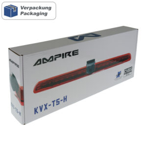 Fahrzeugspezifische CVBS (NTSC) Rückfahrkamera für den VW Transporter T5 mit Heckklappe. Die KVX-T5-H wird gegen das werkseitige linke Bremslichtglas einfach ausgetauscht. KOMPATIBILITÄT VW T5 mit Heckklappe. Kompatibel mit Transporter, Caravelle, Multivan, California und TransVan. (Nicht kompatibel bei T5 mit Hochraumdach) VW T6/T6.1 mit Hochraumdach TECHNISCHE DATEN – Bildwiedergabe gespiegelt – Bildsensor: 1/3″ CMOS High performance Digital Super Clarity Image Sensor – Auflösung 756×504 Pixel – Betrachtungswinkel 150° diagonal – Bildformat: NTSC – 480 Zeilen Auflösung – IP69 wasserdicht – Betriebsspannung: 9-16 Volt DC – Stromverbrauch: max. 200mA – Betriebstemperatur: -20° bis 70°C – Mindestbeleuchtung: 0,2 Lux – Farbe: schwarz – Kabellänge: 10 Meter mit 4-poligen MINI-DIN Steckern – E Zulassung E9-10R-05.1652 – CE Zulassung EN 55022: 2010; EN 61000-3-2:2006+A1:2009+A2:2009; EN61000-3-3:2008; EN 55024:2010 – FCC Zulassung ANSI C63.4-2003 LIEFERUMFANG – Rückfahrkamera – AK1035 Netzteil – AK1034 Mini-DIN Verlängerungskabel 10m WICHTIGER HINWEIS Je nach Dachaufbau und installierter Anhängerkupplung vom Fahrzeug, kann man die Anhängerkupplung auf dem Monitor u.U. nicht sehen.