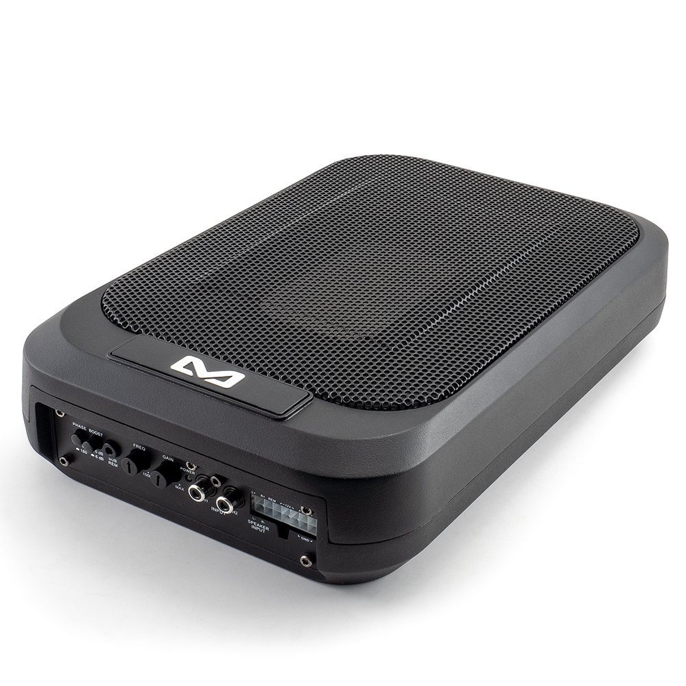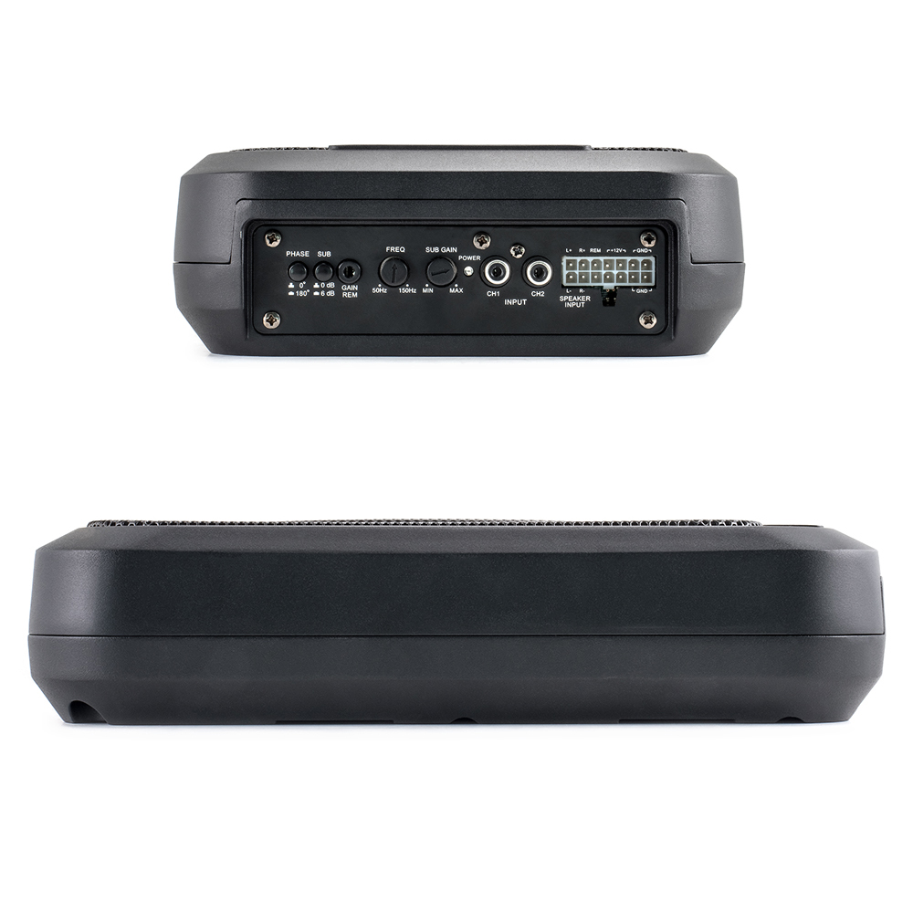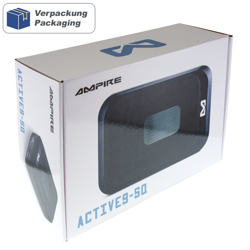 Ultraflaches Aluminium-Gehäuse mit Hochleistungs-Verstärker und einem 7″x9″ Rechteck-Chassis. Dieser Subwoofer liegt voll im Trend, weil er sich gut in beengten Verhältnissen, z.B. unter den Vordersitzen, unterbringen lässt. Der entscheidende Vorteil dieser Konstruktion liegt auf der Hand: Dank seiner kompakten Bauform und seiner High- und Low-Level-Eingänge findet dieser Aktiv-Subwoofer Anschluss an jedes vorhandene Soundsystem. Der ACITIVE9-SQ schaltet sich durch die „Auto Turn-On“ Funktion automatisch über die Lautsprechereingänge ein. TECHNISCHE DATEN – Aluminium-Druckguss-Gehäuse, geschlossen – Chassisdurchmesser: 7″x9″ Rechteckmembran – Passivmembran 4″x7″ – Membranfläche 376cm³ – Edelstahl/Nylon-Compound-Flachmembran mit Gummisicke – Sinusleistung: 230 Watt RMS Class D – Musikleistung: 460 Watt maximal – Low-Level Cinch-Eingänge 100mV bis 10 Volt (RCA) – High-Level Lautsprecher- Eingänge mit „Auto Turn-On“ – Tiefpassweiche: 30-180Hz regelbar – Bass-Level -Fernbedienung – Phasenregler 0° / 180° schaltbar – Frequenzbereich: 30-180Hz. – Signal/Rauschabstand: 104dB – Betriebsspannung: 8 – 17VDC – ATC Sicherung 20A – Gehäuseabmessungen: 308x70x200mm (BxHxL) INSTALLATIONS HINWEISE Die verwendeten Lautsprecherchassis sind sehr hart aufgehangen und müssen erst ein paar Stunden eingespielt werden bis diese den maximalen Schalldruck erreichen.