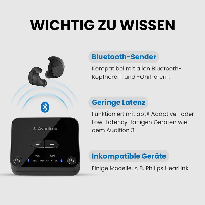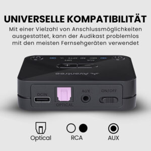 Der Audikast 3 unterstützt optischen (TOSLINK) und AUX- (3,5-mm) Audioausgänge. Bitte überprüfen Sie vor dem Kauf die Audioausgangsoptionen Ihrer Signalquelle, um die Kompatibilität sicherzustellen. Mit diesem Produkt können Sie Bluetooth-Kopfhörer oder -Ohrhörer mit dem Transmitter verbinden und den Ton Ihrer Tonquelle kabellos genießen.