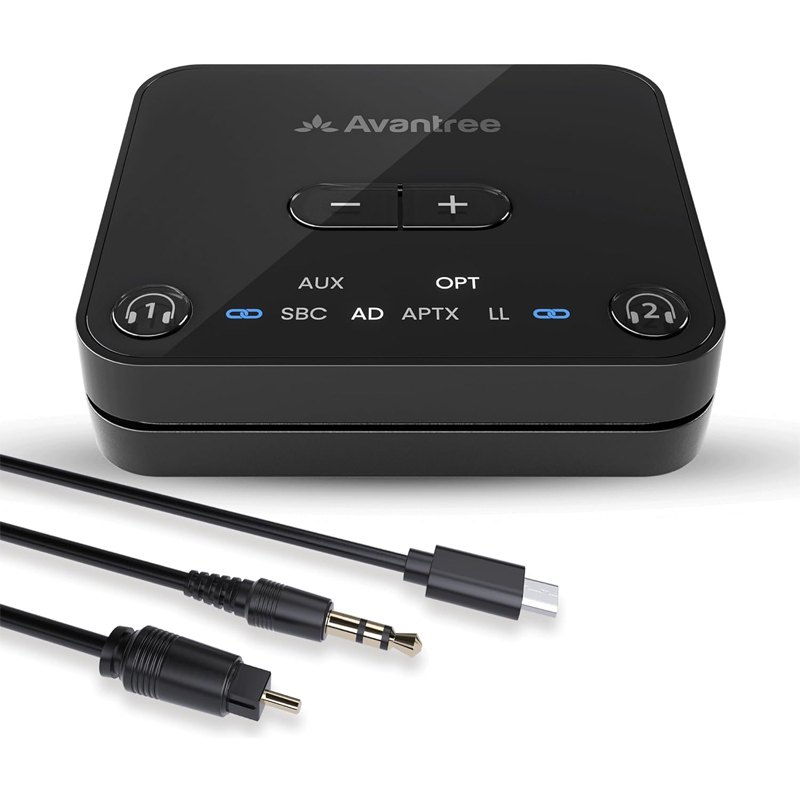AVANTREE Bluetooth 5.3 Sender für zwei Stereo Bluetooth Kopfhörer mit einem optischem oder 3.5mm Klinke AUX-Audioeingang. Der Sender unterstützt aptX-Adaptive und Low Latency, Dual Link für zwei Kopfhörer und bis zu 30 Meter Reichweite.