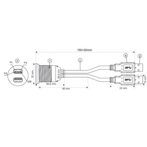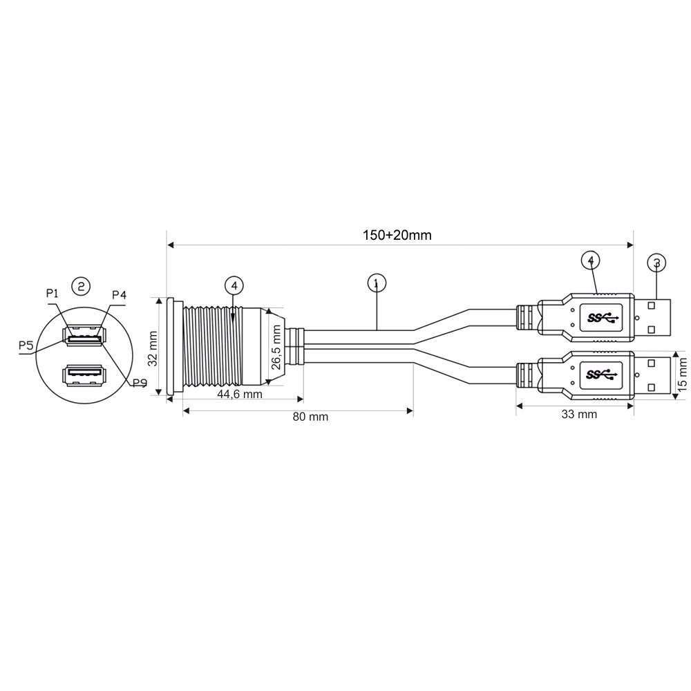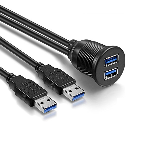 Robustes Doppel USB 3.0 Verlängerungskabel mit Einbaubuchse und Halterung – lässt Ihnen mehr Spielraum beim Anschließen Ihrer USB-Geräte. – besonders geeignet z.B. zur Anwendung mit MP3 Autoradios TECHNISCHE DATEN – Kabellänge 15cm – Bohrung 29mm – Typ A Buchse auf A Stecker – High-Speed USB 3.0 – dreifach geschirmt – Innenleiter: 9 x AWG 28 Kupfer – Farbe schwarz ALTERNATIVE VARIANTEN – XUD060 mit 60cm Kabel – XUD200 mit 200cm Kabel