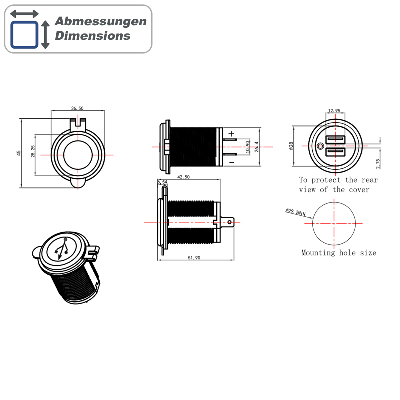 Dual USB-A Ladegerät in kompakter Bauform für 12/24 Volt mit 2100mA Ausgangsstrom zum Einbau in Fahrzeugen, Boote und Wohnwagen. Dieses Ladegerät/Netzteil ist bestens geeignet zum schnellen Aufladen von Geräten mit integriertem Akku. Das Laden von Handys, MP3-Playern, Tablets etc. ist möglich insofern diese über den USB-A Anschluss geladen werden. FUNKTIONEN – Dual USB-A Ladegerät für 12/24 Volt DC – unterstützt auch das Apple iPhone, iPod – belastbar bis maximal 2,1 Ampère – blaue Status LED TECHNISCHE DATEN – USB-A 2.0 Buchse – Nenn-Eingangsspannung 12/24 Volt DC – Nenn-Ausgangsspannung 5 Volt DC – max. Strombelastbarkeit 2100 mA – Stromaufnahme ohne Last <3,5mA - Stromaufnahme bei Volllast 1A@13VDC - spritzwassergeschützt - Gesamtlänge 53mm - Einbautiefe 46mm - Bohrloch 29mm - Farbe schwarz WEITERE SUCHBEGRIFFE TBD WICHTIGER HINWEIS Achten Sie bei der Einbauposition von dem Artikel auf ausreichenden Abstand zu Antennen und Radios. Ladegeräte können bei hoher Belastung die Empfangseigenschaften beeinflussen.