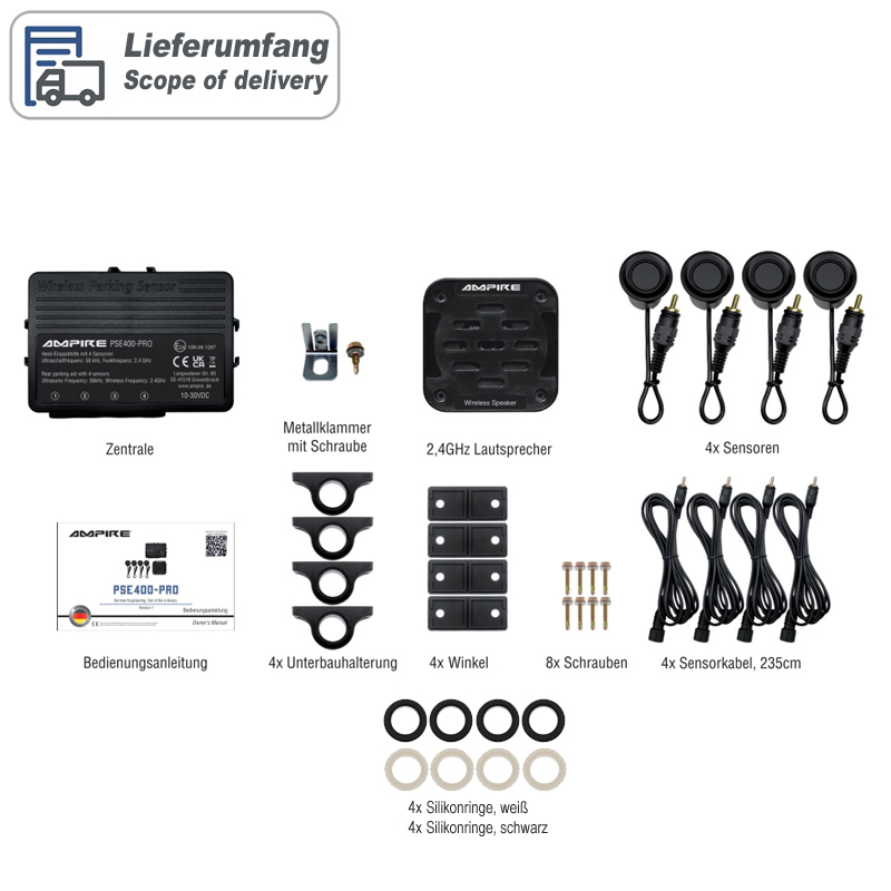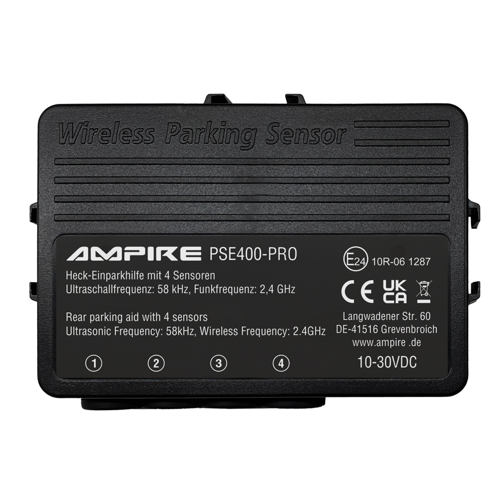Endlich haben Sie einen Parkplatz gefunden. Sie wollen den nachfolgenden Verkehr nicht länger aufhalten als nötig und so groß ist die Parklücke nun auch wieder nicht. Jetzt heißt es, schnell aber mit Übersicht handeln. Denn eine kleine Unachtsamkeit kann fatale Folgen haben. Schnell entstehen nach einem kleinen Parkrempler Kosten in Höhe von 500 EUR und mehr. Wie ein Beifahrer der Sie mit sicherem Auge einweist, hilft Ihnen die wasserdichte AMPIRE Heck-Einparkhilfe bei dieser kleinen Herausforderung – nur noch viel schneller und zuverlässiger. Dieses, speziell für offene Fahrzeuge und Anhänger entwickelte System aktiviert sich automatisch mit dem Einlegen des Rückwärtsgangs und ermöglicht Ihnen eine lückenlose Überwachung des hinteren Bereichs. Sie werden rechtzeitig akustisch vor Hindernissen gewarnt und somit vor Personen- und Sachschäden bewahrt – und das Einparken wird zum Kinderspiel. Die Sensoren können samt den mitgelieferten Unterbauhalterungen unter Anhänger, pritschen oder anderen offenen Konstruktionen befestigt werden. Die Kabellose Übertragung zum Lautsprecher geschieht auf 2.4GHz und ist für Fahrzeuge und Gespanne bis zu einer maximalen Länge von 30m geeignet. Variante – Einbauort: Heck-Stoßfänger – Aktivierung: über 12 Volt von der Rückfahrleuchte – Einbauart: von vorne in das Einbauloch oder Aufbauhalterung gesteckt – Farbe: mattschwarz lackiert Ihre Vorteile auf einen Blick – Lückenlose Überwachung hinter dem Fahrzeug – Automatische Aktivierung beim Einlegen des Rückwärtsgangs – Rechtzeitige Warnung vor Hindernissen – Vermeidung von Personen- und Sachschäden – Einfaches Einparken in enge Parklücken – Selbstdiagnosefunktion – Akustische Warnung – 4 mattschwarz lackierte Ultraschallsensoren für Stoßstangenmontage von vorne oder zur Montage unter dem Fahrzeug / dem Anhänger. – 22mm Bohrloch, 24mm Einbautiefe – Reichweite einstellbar zwischen 30cm bis 100cm und 30cm bis 260cm – Reichweite (Werkseinstellung) von 160cm bis 30cm – Einfachste Montage durch Steckverbindungen – Kabellose Verbindung zwischen der Zentrale und dem Lautsprecher, maximale Reichweite 30m – Wasserdichtes Gehäuse – E-Typgenehmigung E24 10R-06 1287 Technische Daten – Ultraschallfrequenz: 58kHz – Erfassungswinkel: vertikal/horizontal: 60° +/- 10° Grad – Funkfrequenz zwischen Zentrale und Lautsprecher: 2,4GHz – Temperaturbereich: -40°C bis +80°C – Betriebsspannung: 10-30VDC – Stromaufnahme Zentrale (max): 55mA – Stromaufnahme Lautsprecher (max): 80mA – Stromaufnahme ACC aus: 0mA – Sensor-Kabellängen: 235cm – Reichweiten Level 1: 30-100cm Level 2: 30-130cm Level 3: 30-160cm (Werkseinstellung) Level 4: 30-210cm Level 5: 30-260cm – Gesamtgewicht: 512g OPTIONALES ZUBEHÖR – Lochsäge: LS22.0 HINWEIS ZUR POSITIONIERUNG DER SENSOREN Das fehlerfreie Funktionieren der PDC hängt von der Position und der Ausrichtung der Sensoren ab, daher ist es wichtig vor dem Installationsbeginn einige Bedingungen zu überprüfen. Der Bereich innerhalb des Stoßfängers muss ausreichend Tiefe und Platz für eine problemlose Montage haben. Die Sensoren müssen zwischen 35 bis 65cm hoch in dem Stoßfängers angebracht werden. Die Sensorfläche muss vertikal zum Boden ausgerichtet sein. Der Abstand zwischen den Sensoren kann zwischen 30 bis 70cm variieren und sollte gleichmäßig sein. Die Abstände der äußeren Sensoren müssen gleich sein. HINWEIS ZUR HANDHABUNG Bei Fahrzeugen mit eingebauter Anhängerkupplung sollte bei Anhängerbetrieb das PDC-System nicht aktiviert werden. In einigen Fällen kann es vorkommen, dass kleinere Gegenstände, Sträucher, Stangen oder Pfosten nicht von dem System erkannt bzw. erfasst werden können und es ohne menschliches Eingreifen zu einer Beschädigung des Fahrzeuges führen kann. HINWEIS ZUR INSTALLATION Bitte verbinden Sie den Plusanschluss des Lautsprechers mit der Zündungsleitung (KL15) und nicht mit Dauerplus um eine Tiefentladung der Fahrzeugbatterie zu vermeiden. Ein Einbau der Sensoren in Metallstoßstangen ist nicht möglich. HINWEIS ZUR SICHERHEIT Die Verantwortung beim Einparken und anderen Rangiermanövern liegt ausschließlich beim Fahrer! Die elektronische Einparkhilfe ist ein Fahrerassistenzsystem, kann die Aufmerksamkeit des Fahrers aber nicht ersetzen. Durch physikalische Grenzen kann es auch bei der Ultraschallmessung, bei schlechter Schallreflektion, zu toten Bereichen in der Objekterfassung kommen. Aus diesem Grund liegt die Einschätzung von Hindernissen immer im Verantwortungsbereich des Fahrers. WEITERE SUCHBEGRIFFE Acoustic- Parking- System (APS), Park- Distance- Control (PDC), Parking- Assist- Module (PAM), Parktronic, Parking-Assist-System (PAS)