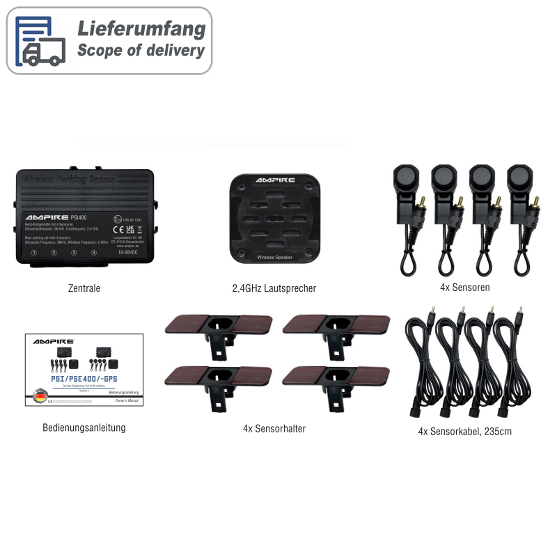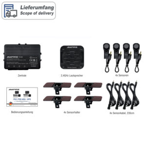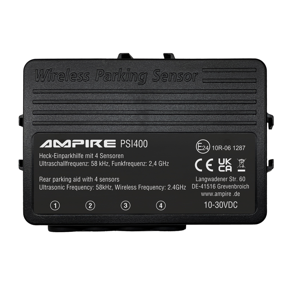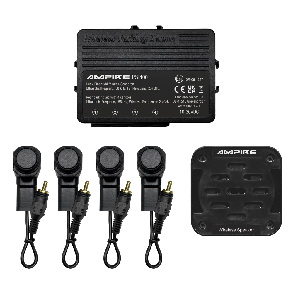 Endlich haben Sie einen Parkplatz gefunden. Sie wollen den nachfolgenden Verkehr nicht länger aufhalten als nötig und so groß ist die Parklücke nun auch wieder nicht. Jetzt heißt es, schnell aber mit Übersicht handeln. Denn eine kleine Unachtsamkeit kann fatale Folgen haben. Schnell entstehen nach einem kleinen Parkrempler Kosten in Höhe von 500 EUR und mehr. Wie ein Beifahrer der Sie mit sicherem Auge einweist, hilft Ihnen die AMPIRE Einparkhilfe bei dieser kleinen Herausforderung – nur noch viel schneller und zuverlässiger. Das System aktiviert sich automatisch beim Rückwärtsfahren und ermöglicht Ihnen eine lückenlose Überwachung des Rückraumes. Sie werden rechtzeitig akustisch vor Hindernissen gewarnt und somit vor Personen- und Sachschäden bewahrt – und das Einparken wird zum Kinderspiel. Die Sensoren sind fast bündig in der Stoßstange eingelassen. Variante – Einbauort: Heck-Stossfänger – Aktivierung: über 12 Volt von der Rückfahrleuchte – Einbauart: von hinten in das Einbauloch geklebt – Farbe: mattschwarz lackiert Ihre Vorteile auf einen Blick – Lückenlose Überwachung des Rückraumes – Rechtzeitige Warnung vor Hindernissen – Vermeidung von Personen- und Sachschäden – Einfaches Einparken in enge Parklücken – Selbstdiagnosefunktion – Akustische Warnung – Automatische Aktivierung beim Rückwärtsfahren – 4 mattschwarz lackierte Ultraschallsensoren für Stoßstangenmontage von hinten (OEM-Design) – 16,5mm Bohrloch, 25mm Einbautiefe – Reichweite einstellbar zwischen 30cm bis 100cm und 30cm bis 260cm – Reichweite (Werkseinstellung) von 160cm bis 30cm – Einfachste Montage durch Steckverbindungen – Kabellose Verbindung zwischen der Zentrale und dem Lautsprecher, maximale Reichweite 12m – E-Typgenehmigung E24 10R-06 1287 Technische Daten – Ultraschallfrequenz: 58kHz – Erfassungswinkel: vertikal/horizontal: 60° +/- 10° Grad – Funkfrequenz zwischen Zentrale und Lautsprecher: 2,4GHz – Temperaturbereich: -40°C bis +80°C – Betriebsspannung: 10-30VDC – Stromaufnahme Zentrale (max): 55mA – Stromaufnahme Lautsprecher (max): 80mA – Stromaufnahme ACC aus: 0mA – Sensor-Kabellängen: 235cm – Reichweiten Level 1: 30-100cm Level 2: 30-130cm Level 3: 30-160cm (Werkseinstellung) Level 4: 30-210cm Level 5: 30-260cm – Gesamtgewicht: 524g OPTIONALES ZUBEHÖR – Blechstanze 16,5mm: PW165 – Schrägeinbau-Montageset, 5°: PB-PSI-5 – Schrägeinbau-Montageset, 15°: PB-PSI-15 – Blechstanze für Schrägeinbau-Montageset PB-PSI-5 und PB-PSI-15: PW220 HINWEIS ZUR POSITIONIERUNG DER SENSOREN Das fehlerfreie Funktionieren der PDC hängt von der Position und der Ausrichtung der Sensoren ab, daher ist es wichtig vor dem Installationsbeginn einige Bedingungen zu überprüfen. Der Bereich innerhalb des Stoßfängers muß ausreichend Tiefe und Platz für eine problemlose Montage haben. Die Sensoren müssen zwischen 35 bis 65cm hoch in dem Stoßfängers angebracht werden. Die Sensorfläche muß vertikal zum Boden ausgerichtet sein. Der Abstand zwischen den Sensoren kann zwischen 30 bis 70cm variieren und sollte gleichmäßig sein. Die Abstände der äußeren Sensoren müssen gleich sein. HINWEIS ZUR HANDHABUNG Bei Fahrzeugen mit eingebauter Anhängerkupplung sollte bei Anhängerbetrieb das PDC-System nicht aktiviert werden. In einigen Fällen kann es vorkommen, dass kleinere Gegenstände, Sträucher, Stangen oder Pfosten nicht von dem System erkannt bzw. erfasst werden können und es ohne menschliches Eingreifen zu einer Beschädigung des Fahrzeuges führen kann. HINWEIS ZUR INSTALLATION Bitte verbinden Sie den Plusanschluss des Lautsprechers mit der Zündungsleitung (KL15) und nicht mit Dauerplus um eine Tiefentladung der Fahrzeugbatterie zu vermeiden. Ein Einbau der Sensoren in Metallstoßstangen ist nicht möglich. HINWEIS ZUR SICHERHEIT Die Verantwortung beim Einparken und anderen Rangiermanövern liegt ausschließlich beim Fahrer! Die elektronische Einparkhilfe ist ein Fahrerassistenzsystem, kann die Aufmerksamkeit des Fahrers aber nicht ersetzen. Durch physikalische Grenzen kann es auch bei der Ultraschallmessung, bei schlechter Schallreflektion, zu toten Bereichen in der Objekterfassung kommen. Aus diesem Grund liegt die Einschätzung von Hindernissen immer im Verantwortungsbereich des Fahrers. WEITERE SUCHBEGRIFFE Acoustic- Parking- System (APS), Park- Distance- Control (PDC), Parking- Assist- Module (PAM), Parktronic, Parking-Assist-System (PAS)