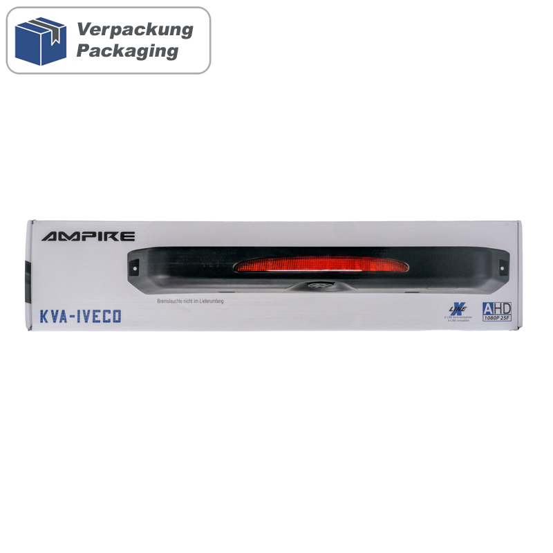 Hochauflösende AHD-Rückfahrkamera KVA-IVECO die anstelle vom werkseitigen Bremslichtgehäuse montiert wird. In das Kameragehäuse ist eine Infrarotbeleuchtung integriert die auch bei Dunkelheit eine ausreichende Ausleuchtung gewährleistet. Passend für: Iveco Daily 6 2014-2022 bzw. baugleiche Transporter TECHNISCHE DATEN – Videostandard AHD 1080P 25F – Bildsensor: GC2053 (FH8536H) – Bildsensorgröße 1/2.9 – Auflösung 1920×1080 Pixel – 3D Rauschunterdrückung – Sequential Scanning – Mindestbeleuchtung: 0,01 Lux – Infrarotbeleuchtung für Sicht bei Nacht – Signal/Rauschabstand >43dB – Automatischer Weißabgleich – Bildwiedergabe horizontal gespiegelt – Hilfslinien: eingeschaltet (ausschaltbar durch Kabelschlaufe trennen) – horizontaler Betrachtungswinkel 125° – vertikaler Betrachtungswinkel 70° – diagonaler Betrachtungswinkel 165° – bis 20° vertikal einstellbarer Kamerakopf – Schutzklasse IP68 wasserdicht – Betriebsspannung: 9-16 Volt DC – Stromverbrauch: max. 250mA – Betriebstemperatur: -20° bis 70°C – Farbe: schwarz – Kabellänge: 10 Meter mit 4-pol. MINI-DIN Steckern – E Zulassung E9-10R-05.1652 – CE Zulassung EN 55022: 2010; EN 61000-3-2:2006+A1:2009+A2:2009; EN61000-3-3:2008; EN 55024:2010 – FCC Zulassung ANSI C63.4-2003 LIEFERUMFANG Rückfahrkamera mit Gehäuse AK1037 Netzteil mit blauen Steckern AK1039 Mini-DIN Verlängerungskabel 10m mit blauen Steckern WICHTIGER HINWEIS Je nach Dachaufbau und installierter Anhängerkupplung vom Fahrzeug, kann man die Anhängerkupplung auf dem Monitor u.U. nicht sehen. HINWEIS ZUR BESTELLUNG Diese Kamera ist eine hochauflösende AHD-Kamera mit 1080P Auflösung und 25 Bildern/Sekunde. Diese Kamera kann ausschließlich an kompatiblen Monitoren, Autoradios oder Interfaces angeschlossen werden. Sollte der Kameraeingang an ihrem Monitor nur ein Videosignal in CVBS, FBAS oder NTSC darstellen können, ist diese AHD-Kamera ungeeignet und verwenden Sie dann die baugleiche CVBS-Kamera mit NTSC Videosignal.