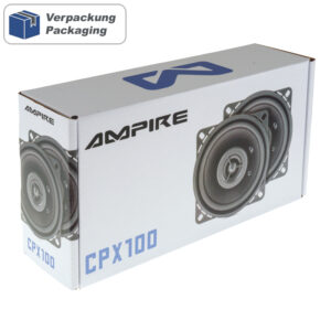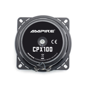 Bei diesem neuen AMPIRE 10cm Koaxiallautsprecher können klangverschlechternde Partialschwingungen durch seine patentierte CIPP-Cone Membrane nahezu ausgeschlossen werden. Außerdem konnte eine hörbar tiefere Basswiedergabe durch die Verwendung der ISD-Technologie erreicht werden. LIEFERUMFANG 2 Stück Lautsprecher TECHNISCHE DATEN – Nenndurchmesser 10cm/4″ – Belastbarkeit 40/80 Watt RMS – Einbautiefe 48mm – Magnet 70x32x10mm (Y30) THIELE/SMALL PARAMETER – Fs 80,6Hz – VAS 3,1Liter – Qts 0,69 – Qes 0,85 – Qms 3,67 – Re 3,6 Ohm – Z 4 Ohm – Le 0,6mH – SPL 89dB – Mms 4,9g – Xmax 2mm – Sd 52,8cm² – Vd 10,6cm³ – D 82mm – Überstand des Hochtöners: 5mm WEITERE SUCHBEGRIFFE: – ce100, CE100, cp100, CP100, CPX100, cpx100