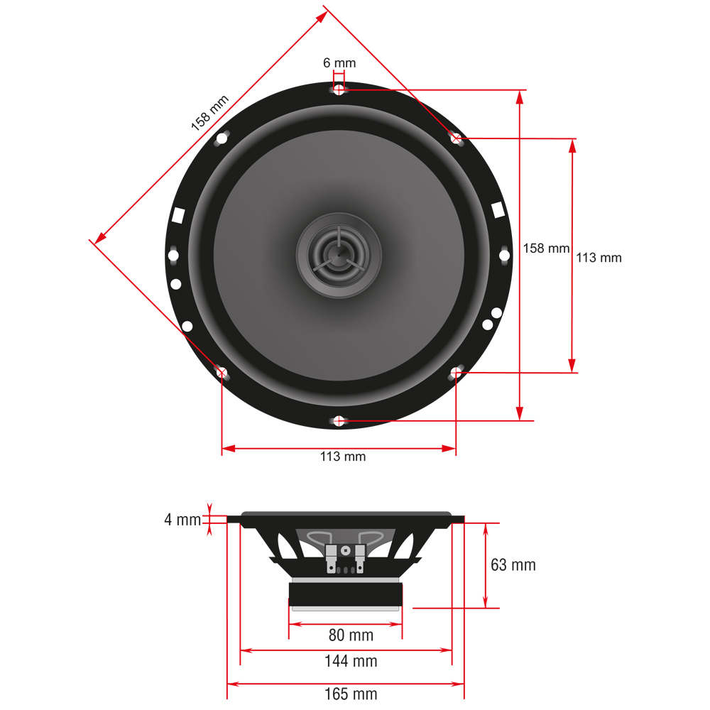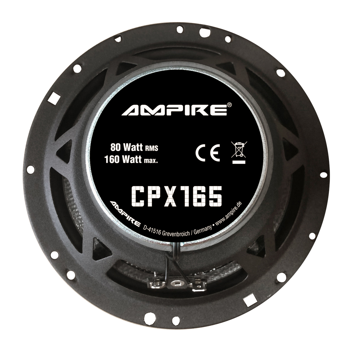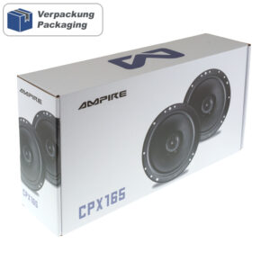 Bei diesem neuen AMPIRE 16cm Koaxiallautsprecher können klangverschlechternde Partialschwingungen durch seine patentierte CIPP-Cone Membrane nahezu ausgeschlossen werden. Außerdem konnte eine hörbar tiefere Basswiedergabe durch die Verwendung der ISD-Technologie erreicht werden. Als Hochtöner wurde eine 16mm Kalotte mit Seidenmembran eingesetzt die sich durch ein besonders angenehmes Klangbild auszeichnet. LIEFERUMFANG 2 Stück Lautsprecher TECHNISCHE DATEN – Nenndurchmesser: 16,5cm / 6,5“ – Fs 63Hz. – VAS 15,0 Liter – Qts 0,74 – Qes 0,93 – Qms 3,67 – Re 3,6 Ohm – Z 4 Ohm – Le 0,61mH – SPL 91dB – Mms 11,2gr. – Xmax 3mm – Sd 126,7 cm2 – Vd 38,0 cm3 – D 127mm – Pe 80/160 Watt RMS – Einbautiefe 63mm – Magnetdurchmesser 80mm – Überstand des Hochtöners: 2mm WEITERE SUCHBEGRIFFE: – ce165, CE165, cp165, CP165, CPX165, cpx165