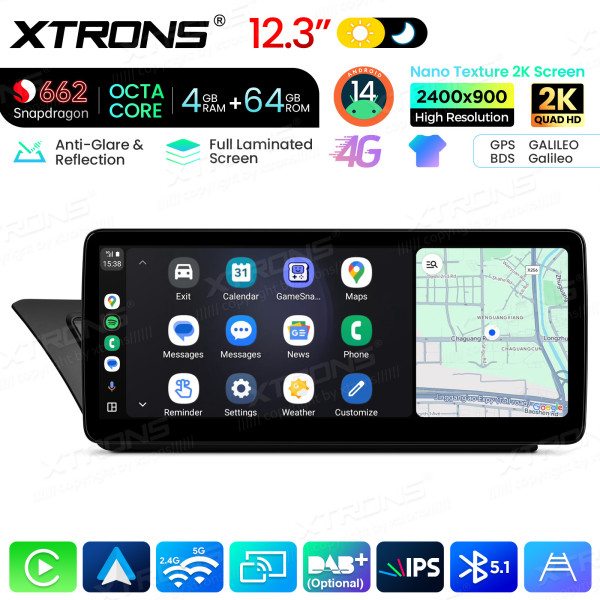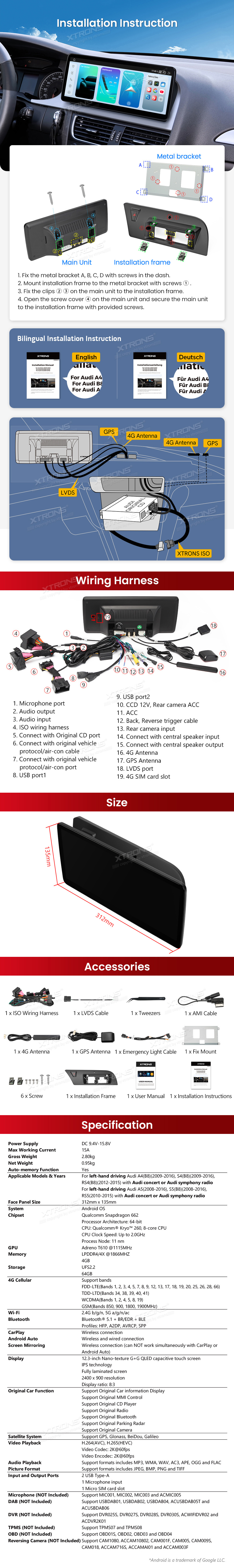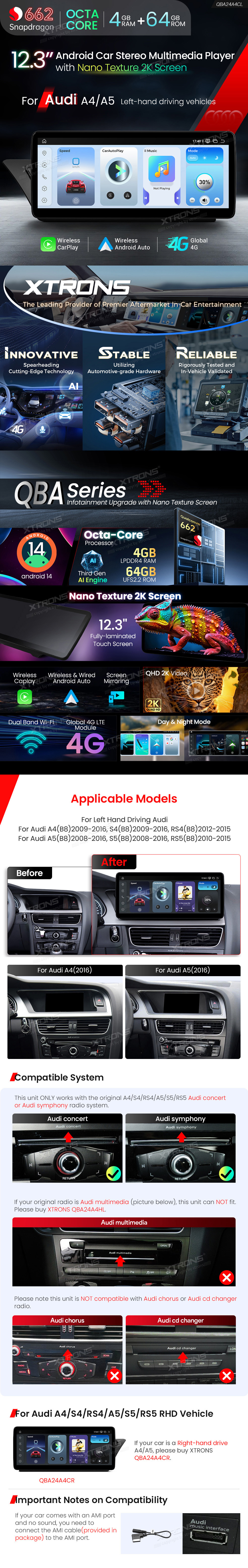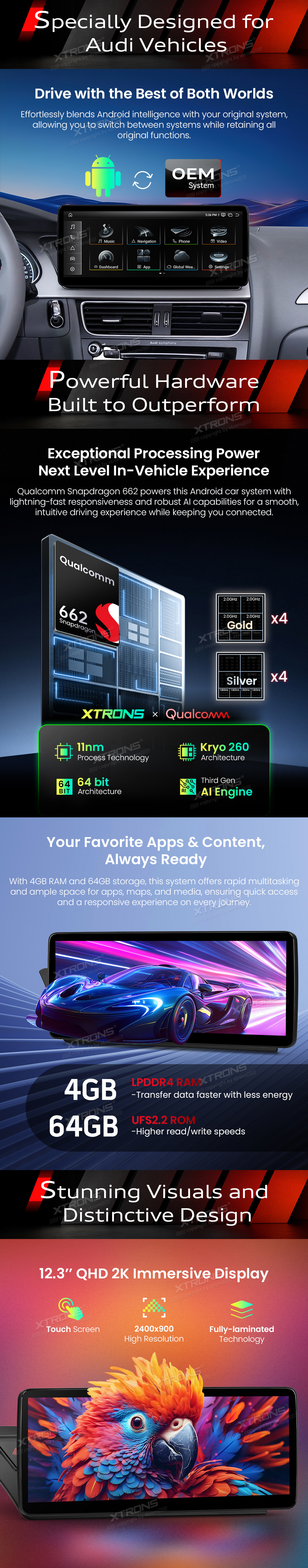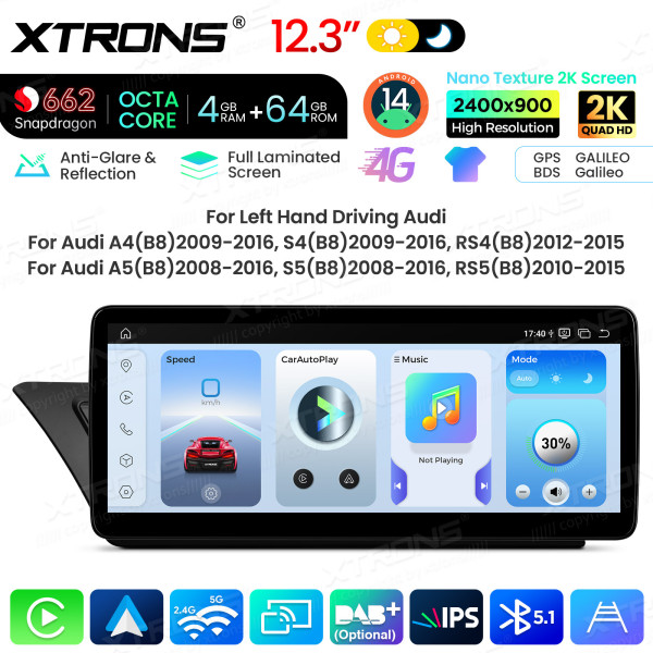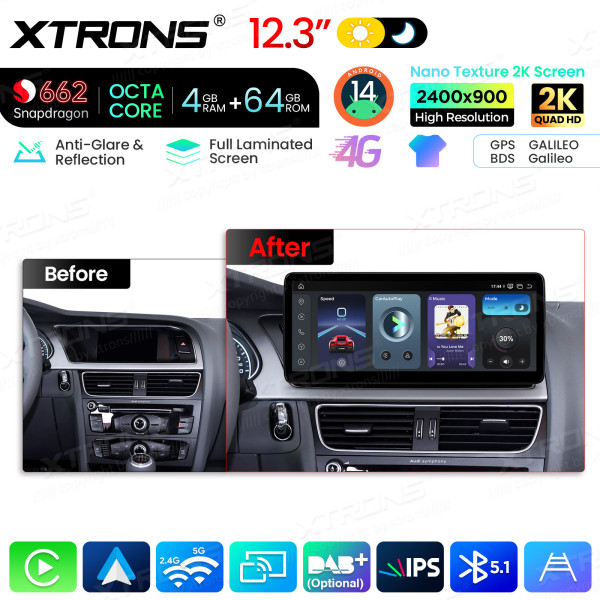 12,3 Zoll Autoradio mit Snapdragon 662 Octa-Core-Prozessor, 4 GB RAM und 64 GB Speicher, Android-Betriebssystem, Nano-Textur-2K-Display für Audi A4/A5 (Linkslenker)