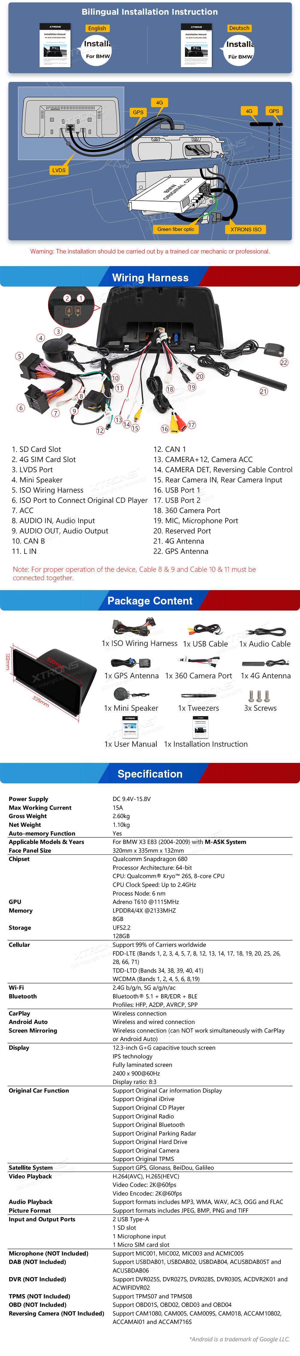 12,3 Zoll 8+128GB Snapdragon 680 2K Screen Global 4G Android Autostereo-Player für BMW X3 E83 (2004-2009) mit M-ASK System