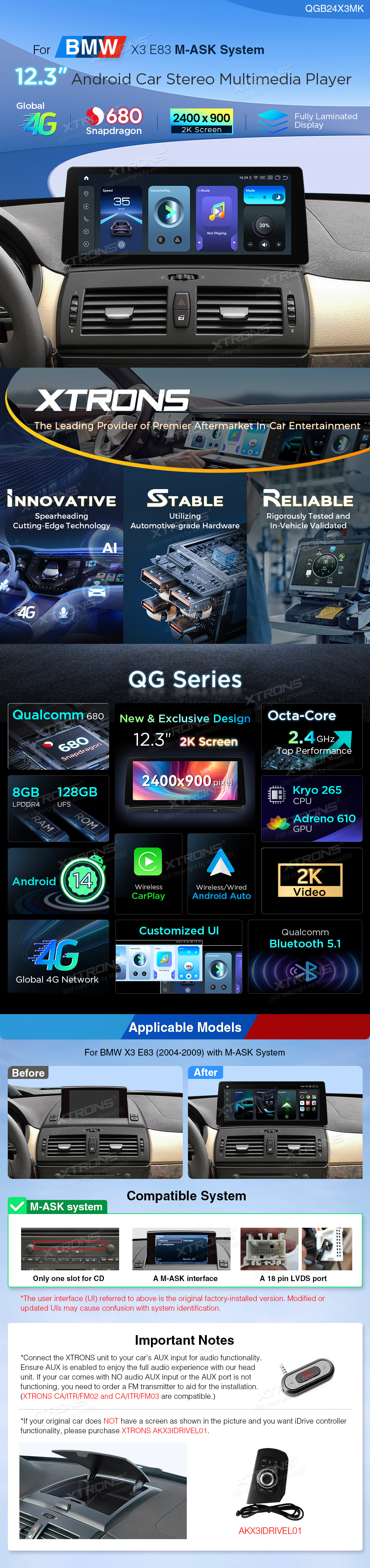 12,3 Zoll 8+128GB Snapdragon 680 2K Screen Global 4G Android Autostereo-Player für BMW X3 E83 (2004-2009) mit M-ASK System