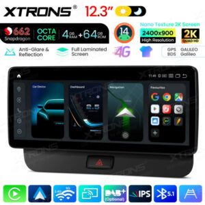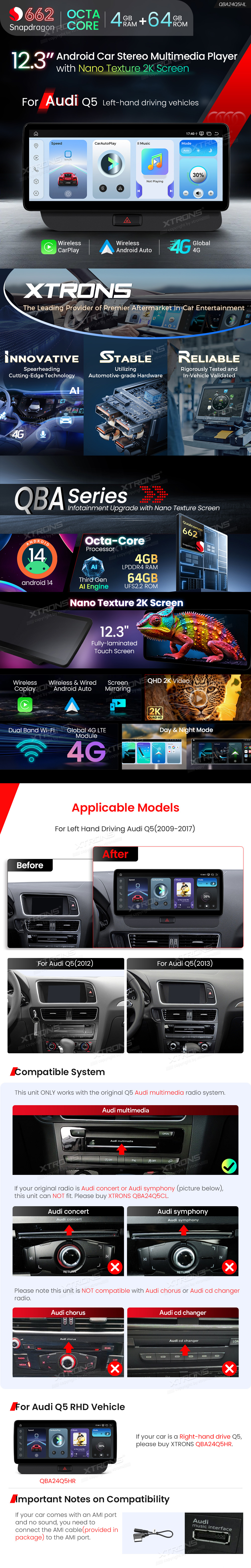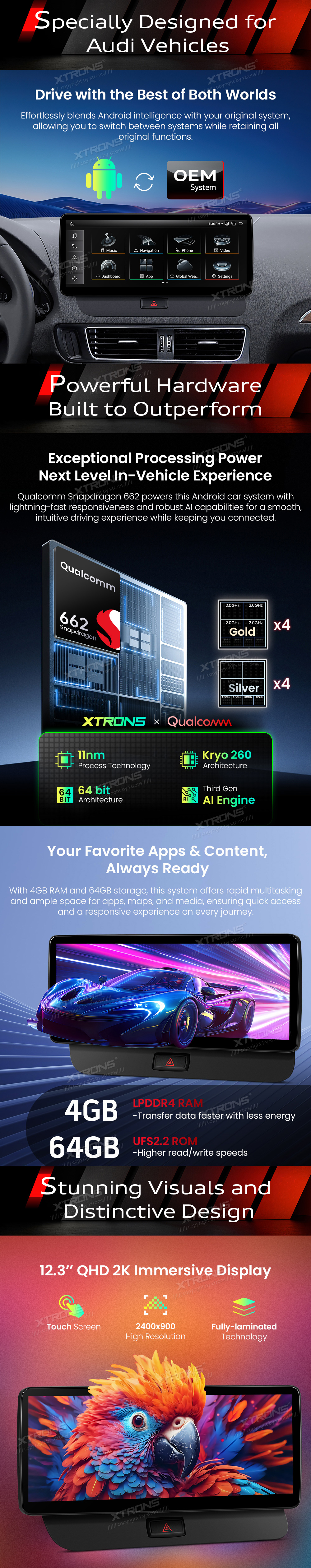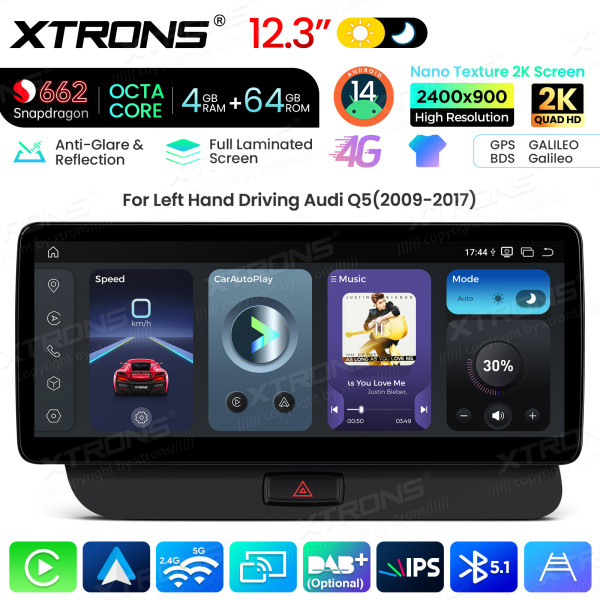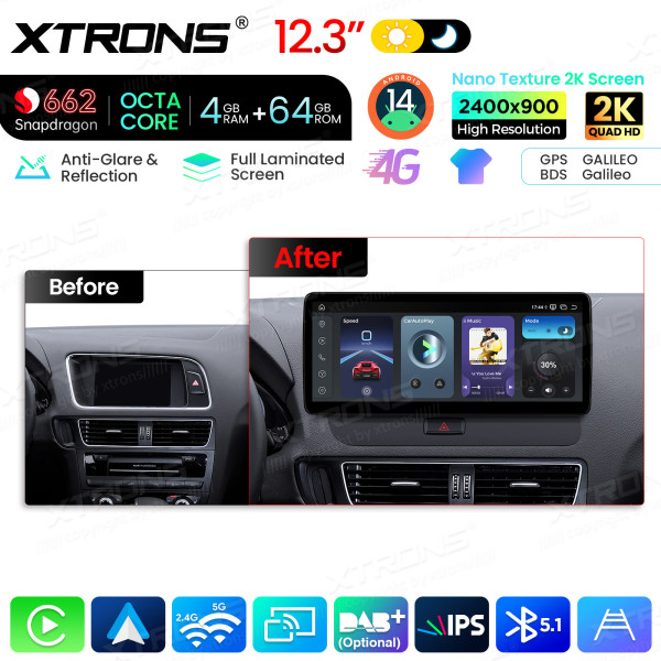 12,3 Zoll Autoradio mit Android, Snapdragon 662 Octa-Core-Prozessor, 4 GB RAM + 64 GB Speicher, 2K-Display mit Nanotextur für Audi Q5 (2009–2017)