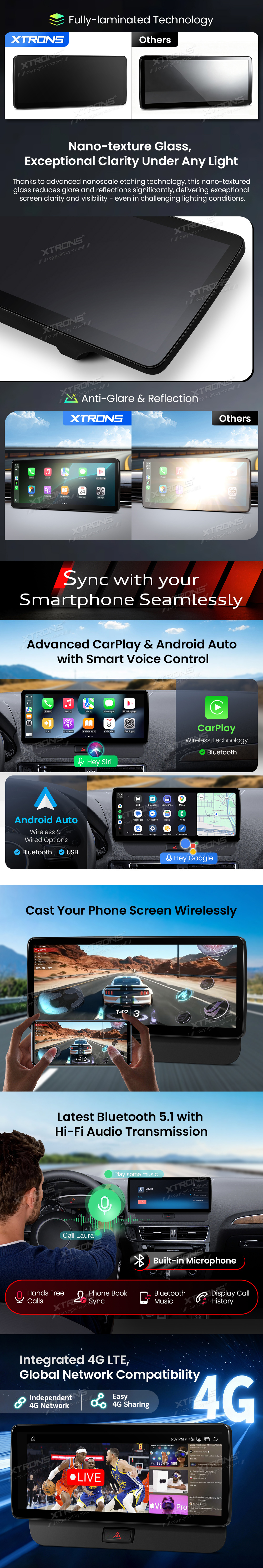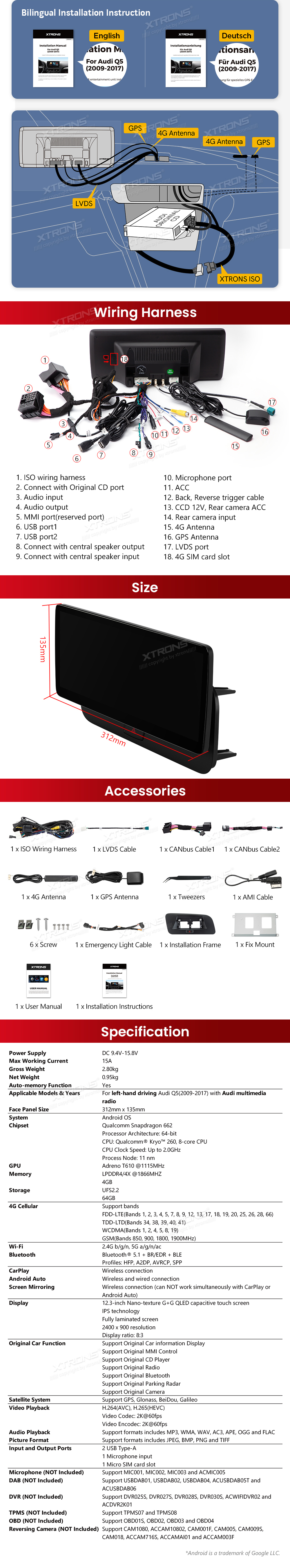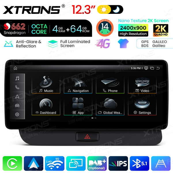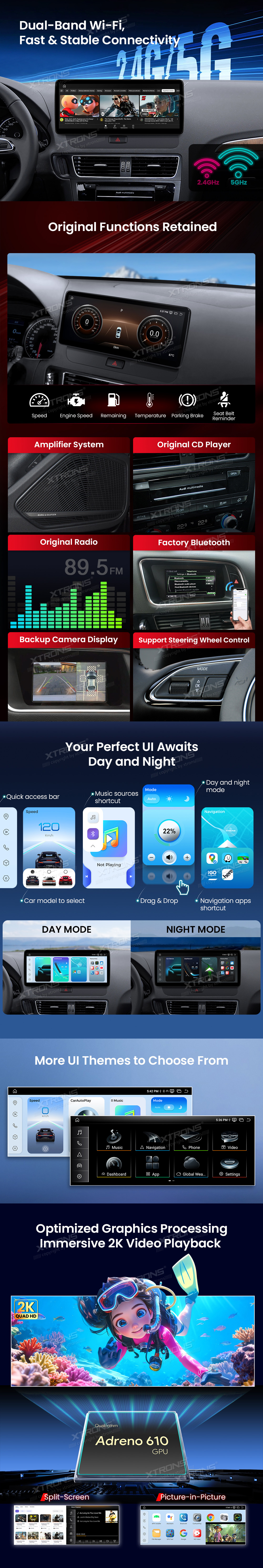 12,3 Zoll Autoradio mit Android, Snapdragon 662 Octa-Core-Prozessor, 4 GB RAM + 64 GB Speicher, 2K-Display mit Nanotextur für Audi Q5 (2009–2017)