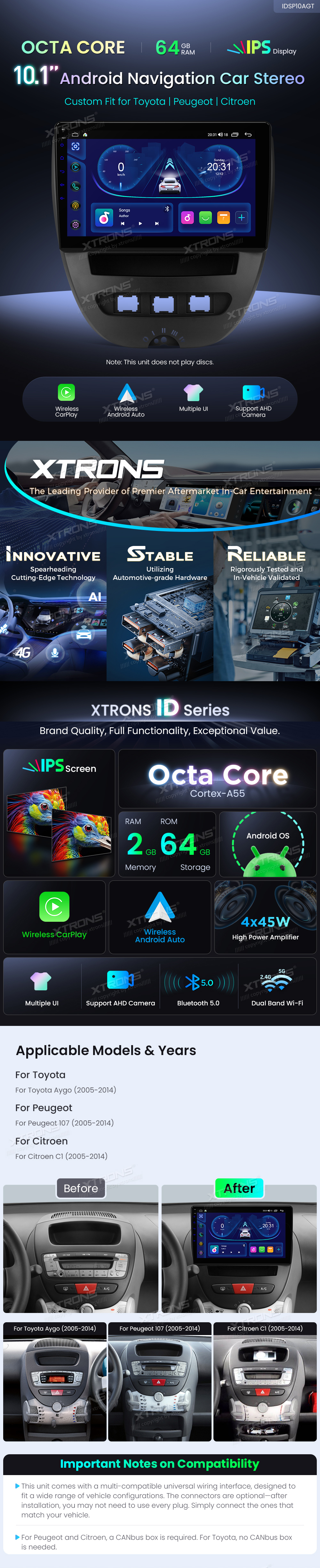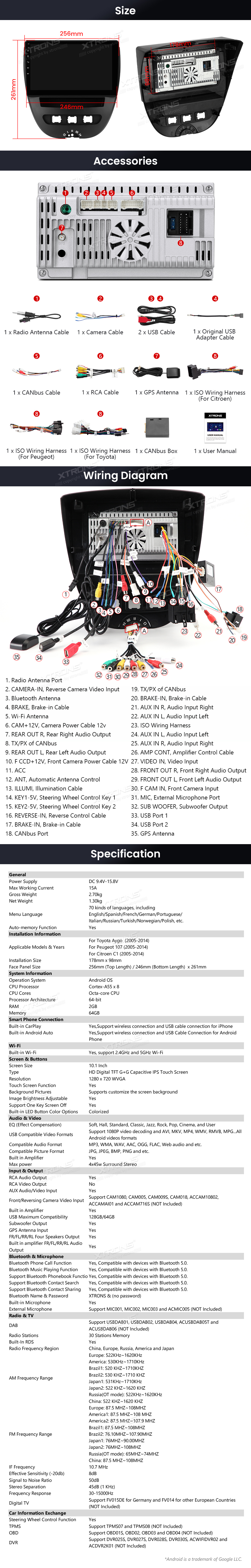 Android Autoradio Xtrons für Toyota Aygo /Peugeot 107 /Citroen C1 (2005-2014) 2/64 GB