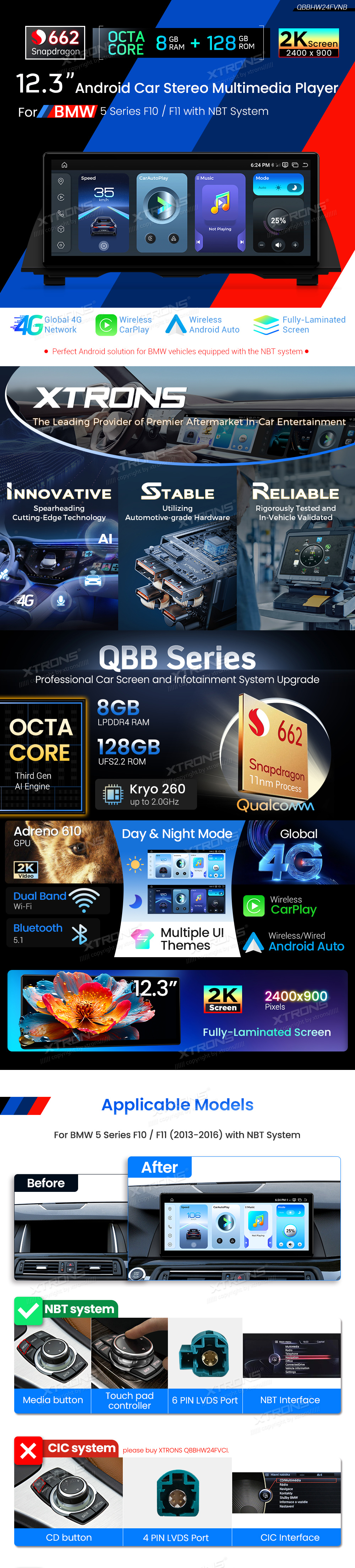12,3 Zoll 8+128 GB Qualcomm 662 2K IPS-Volllaminiertes Display Global 4G Android Autoradio für BMW 5er F10/F11 NBT-System