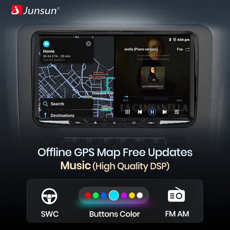 Das Radio schaltet zwischen Tag- und Abendmodus, um die Bildschirmdarstellung an die Umgebung anzupassen. Gängige Funktionen sind oben integriert, sodass Sie mit nur einem Klick zwischen Navigation, Musik, Bluetooth-Anrufen und anderen gängigen Funktionen wechseln können. Junsuns personalisiertes UI-Design steht für Sicherheit während Ihrer gesamten Fahrt.