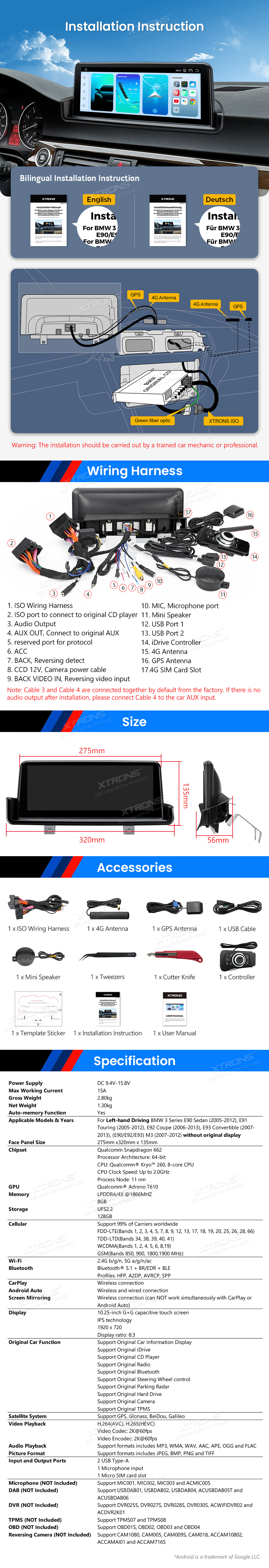 10,25 Zoll 8+128 GB Qualcomm Snapdragon 662 2K-Videowiedergabe Global 4G Android Autoradio für BMW 3er LHD ohne Originaldisplay