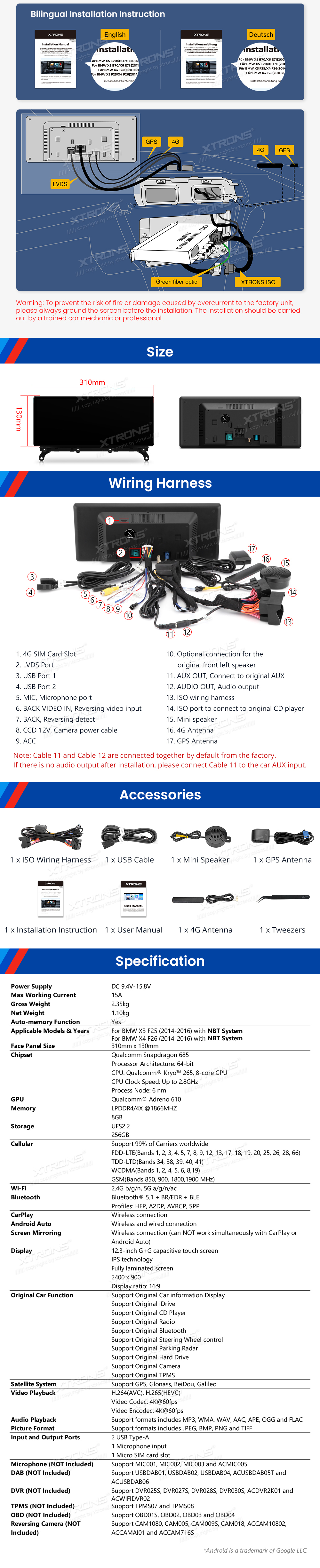 QWBX24NB12X3 12,3 Zoll 2K-Bildschirm Qualcomm Snapdragon 685 8+256 GB Android-Autobildschirm-Upgrade für BMW X3 F25/X4 F26 (2014–2016) NBT-System