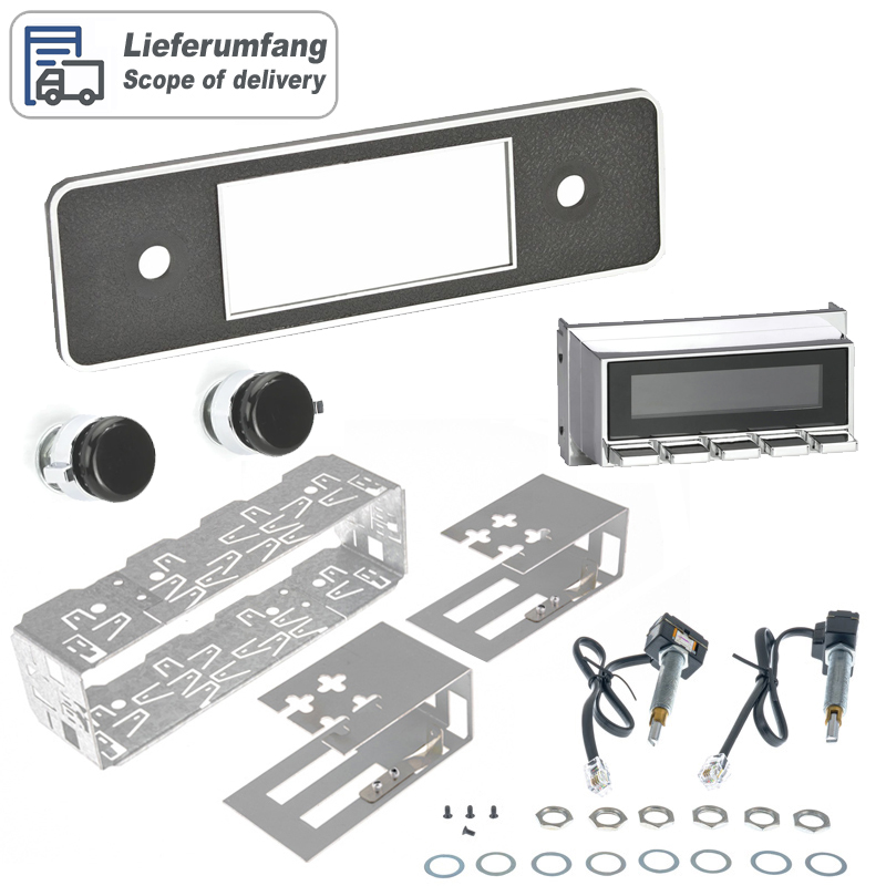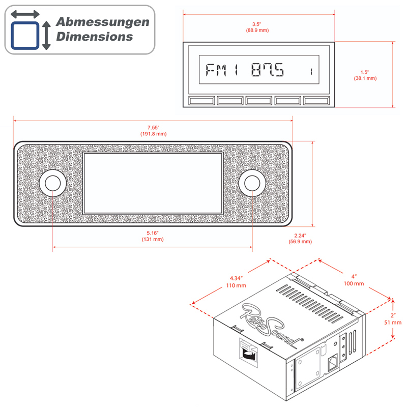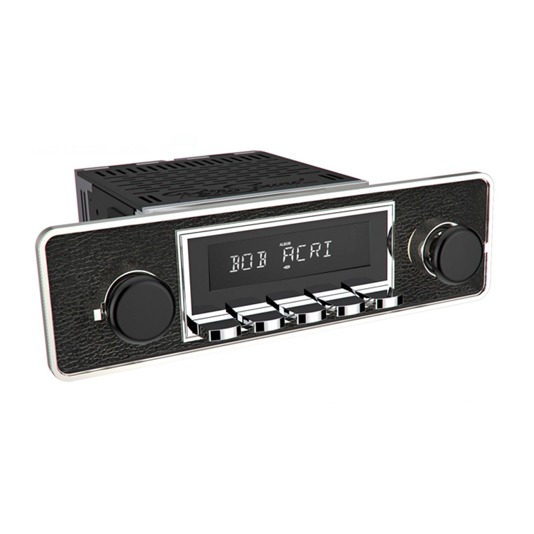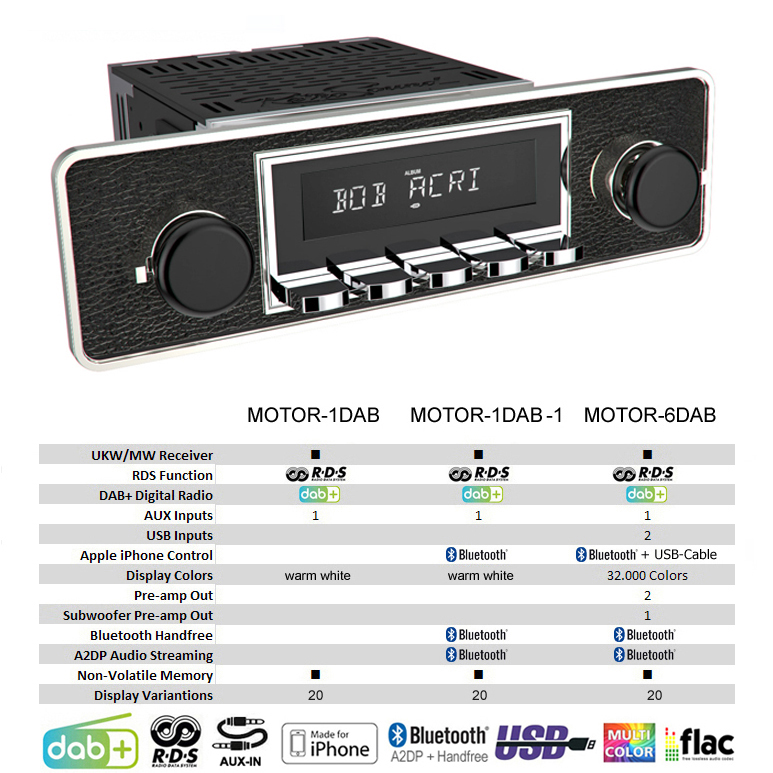 RETROSOUND DAB+ Autoradio im Design „TRIM“ (ohne Radiomodul) LIEFERUMFANG – RETROSOUND Displayeinheit , Artikelnummer: RETRORADIO-C1-FACE – RETROSOUND Bedienknopf, Artikelnummer: RSP-040P – RETROSOUND Bedienring, Artikelnummer: RSP-080P – RETROSOUND DIN-Blende, Artikelnummer: RSP-502 – AMPIRE ISO-Einbausatz, Artikelnummer: RSP-KIT-1 – Bestätigung vom TÜV Süd, Artikelnummer: H-KENNZEICHEN VARIANTEN RADIOMODUL MOTOR-1DAB AUSSTATTUNG – DAB+/UKW/MW Radioempfänger mit RDS und 30 Senderspeicher – Tuner mit europäischen geraden und ungeraden Radiofrequenzen – warmweiße LCD Beleuchtung – Integrierter 4-Kanal Verstärker (4 x 24 Watt RMS / 45 Watt max.) – 3 Equalizerprogramme plus individueller Bass/Höhen/Fader/Balance-Einstellung – XBAS Loudness-Funktion – Nichtflüchtiger Speicher – AUX-Eingang (3.5mm Klinkenbuchse) auf der Geräterückseite – Separate Einschaltleitungen für Motorantenne und Verstärker TECHNISCHE DATEN – UKW Europäischer Rundfunk Frequenzbereich 87,5-107,9 MHz. (0,05 MHz. in Schritten) – MW Frequenzbereich 530-1710 kHz (9 kHz. in Schritten) – DAB+ Empfang über SMB Antenneneingang für passive DAB+ Antennen – Abmessungen Radiomodul 100x110x51mm – Spannungsversorgung 10,5 bis 14,4 Volt – Maximale Stromaufnahme 15 Ampere – Ruhestrom 3,5 mA – Sinus Ausgangsleistung 12V, 4 Ohm, <1% Klirr: 4x18 Watt (RMS) - Impedanz Lautsprecher 4-8 Ohm - Eingangsempfindlichkeit AUX1 >300 mV / 6 kOhm MOTOR-1DAB-1 AUSSTATTUNG – DAB+/UKW/MW Radioempfänger mit RDS und 30 Senderspeicher – Tuner mit europäischen geraden und ungeraden Radiofrequenzen – warmweiße LCD Beleuchtung – Bluetooth A2DP Audiowiedergabe zur drahtlosen Smartphone Integration – Bluetooth Freisprecheinrichtung inklusive einem Mikrofon – Sinus Ausgangsleistung 12V, 4 Ohm, <1% Klirr: 4 x 25 Watt (RMS) - 3 Equalizerprogramme plus individueller Bass/Höhen/Fader/Balance-Einstellung - XBAS Loudness-Funktion - Nichtflüchtiger Speicher - AUX-Eingang (3.5mm Klinkenbuchse) auf der Geräterückseite - Separate Einschaltleitungen für Motorantenne und Verstärker TECHNISCHE DATEN - UKW Europäischer Rundfunk Frequenzbereich 87,5-107,9 MHz. (0,05 MHz. in Schritten) - MW Frequenzbereich 530-1710 kHz (9 kHz. in Schritten) - DAB+ Empfang über SMB Antenneneingang für passive DAB+ Antennen - Abmessungen Radiomodul 100x110x51mm - Spannungsversorgung 10,5 bis 14,4 Volt - Maximale Stromaufnahme 15 Ampere - Ruhestrom 3,5 mA - Ausgangsleistung 12V, 4 Ohm, <1% Klirr: 4x25 Watt (RMS) - Impedanz Lautsprecher 4-8 Ohm - Eingangsempfindlichkeit AUX1 >300 mV / 6 kOhm MOTOR-6DAB AUSSTATTUNG – DAB+/UKW/MW Radioempfänger mit RDS und 30 Senderspeicher – Bluetooth A2DP Audiowiedergabe zur drahtlosen Smartphone Integration – Bluetooth Freisprecheinrichtung inklusive einem Mikrofon – Einstellbare LCD Beleuchtung mit 32.000 verschiedenen Farben – Sinus Ausgangsleistung 12V, 4 Ohm, <1% Klirr: 4 x 25 Watt (RMS) - 2 USB-Eingänge auf der Geräterückseite bis max. 32GB - 1 AUX-Eingang (3.5mm) auf der Geräterückseite - 3 Cinchausgänge (Stereo) für externe Endstufen (Front/Rear/Subwoofer) - 3 Equalizerprogramme plus individueller Bass/Höhen/Fader/Balance-Einstellung - XBAS Loudness-Funktion - Nichtflüchtiger Speicher - Separate Einschaltleitungen für Motorantenne und Verstärker TECHNISCHE DATEN - UKW Europäischer Rundfunk Frequenzbereich 87,5-107,9 MHz. (0,05 MHz. in Schritten) - MW Frequenzbereich 530-1710 kHz (9 kHz. in Schritten) - DAB+ Empfang über SMB Antenneneingang für passive DAB+ Antennen - Abmessungen Radiomodul 100x110x51mm - Spannungsversorgung 10,5 bis 14,4 Volt - Maximale Stromaufnahme 15 Ampere - Ruhestrom 3,5 mA - Sinus Ausgangsleistung 12V, 4 Ohm, <1% Klirr: 4x25 Watt (RMS) - Impedanz Lautsprecher 4-8 Ohm - Cinch Ausgang 2,85 Volt für externen Verstärker - Eingangsempfindlichkeit AUX >300 mV / 6 kOhm OPTIONALES ANTENNENZUBEHÖR In den meisten klassischen Fahrzeugen wurden passive Stab- oder Teleskopantennen verbaut. Diese eignen sich auch für den DAB+ Radioempfang. Bei Scheibenantennen oder elektronisch verstärkten Dachantennen müssen Sie eine separate DAB+ Antenne (z.B. DAB2) installieren und können den DAB1 nicht verwenden. DAB1 – AMPIRE DAB+ Antennensplitter In den meisten klassischen Fahrzeugen wurden passive Stab- oder Teleskopantennen verbaut. Diese eignen sich auch für den DAB+ Radioempfang. Bestellen Sie den DAB1 Antennensplitter in dem Fall gleich mit. Bei Scheibenantennen oder elektronisch verstärkten Dachantennen müssen Sie eine separate DAB+ Antenne installieren. DAB2 – AMPIRE DAB+ Glasklebeantenne Glasklebe-Innenantenne mit günstigen Empfangseigenschaften. Unauffällig, diebstahlsicher und sicher vor mutwilliger Zerstörung. Außerdem macht die keine Windgeräusche und ist bestens geeignet zum Anschluss an ihre RetroSound Autoradio. OPTIONALER VERSTÄRKER Ergänzen Sie ihr RetroSound Radio mit einem zusätzlichen Plug&Play Verstärker für einen viel besseren Klang während der Fahrt. Der von RetroSound entwickelte Quadraphonic Verstärker leistet 4x 45 Watt RMS und passt durch seine kleine B